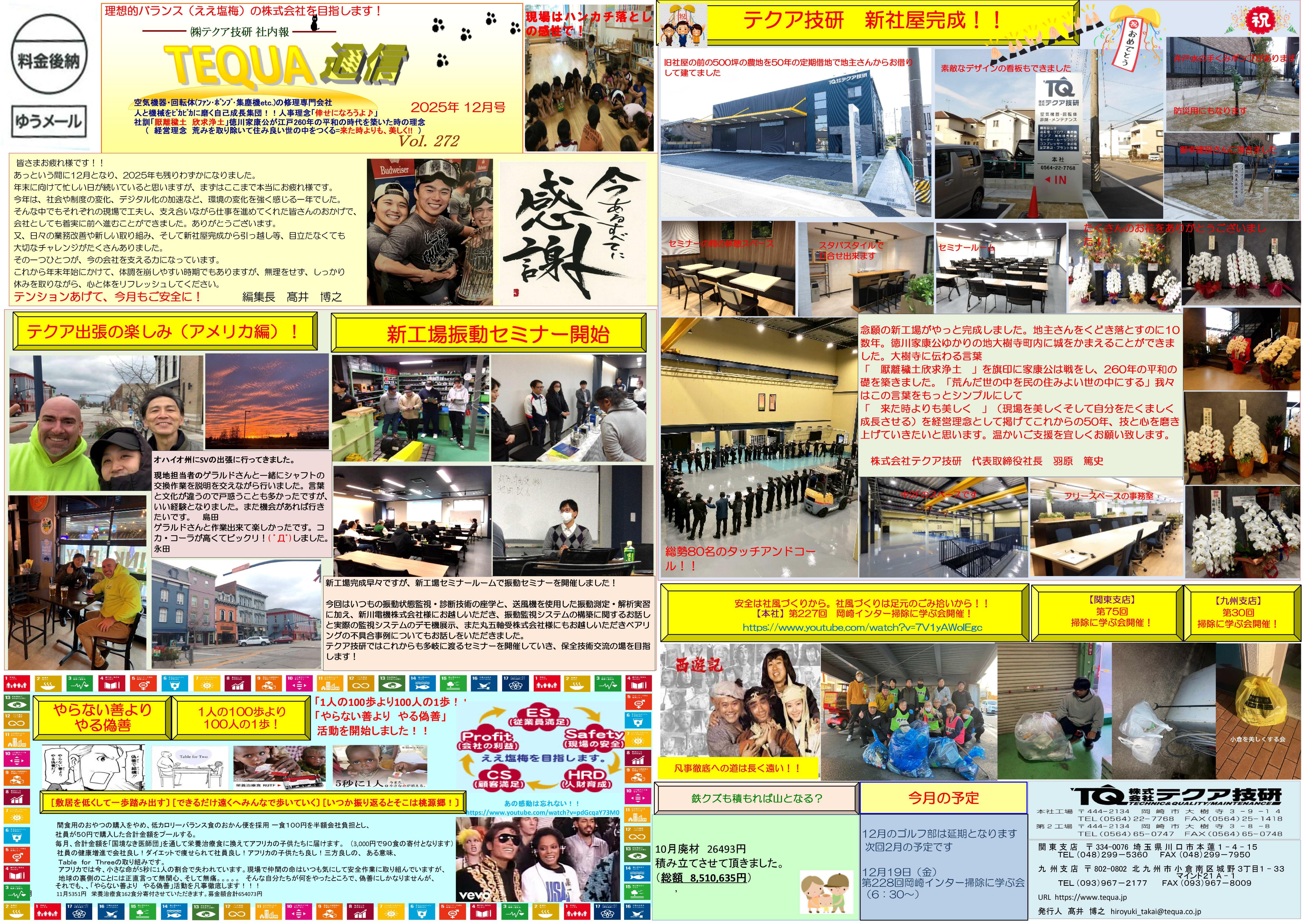 オフィシャルブログ テクア技研 新社屋完成! 2025年12月5日 tequa 念願の新工場がやっと完成しました。地主さんをくどき落とすのに10数年。徳川家康公ゆかりの地大樹寺町内に城をかまえることができました。大樹寺に伝わる言葉 「 厭離穢土欣求浄土 」を旗印に家康公は戦をし、260年の平和の礎を築きました。「荒んだ世の中を民の住みよい世の中にする」我々はこの言葉をもっとシンプルにして 「 来た時よりも美しく 」(現場を美しくそして自分をたくましく成長させる)を経営理念として掲げてこれからの50年、技と心を磨き上げていきたいと思います。温かいご支援を宜しくお願い致します。 株式会社テクア技研 代表取締役社長 羽原 篤史
